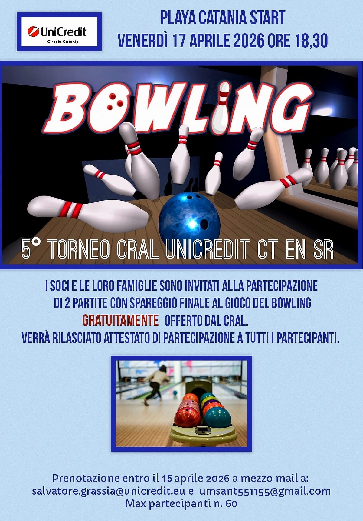 17 APRILE 2026 - 5° Torneo di Bowling Cral Unicrdit CT EN SR