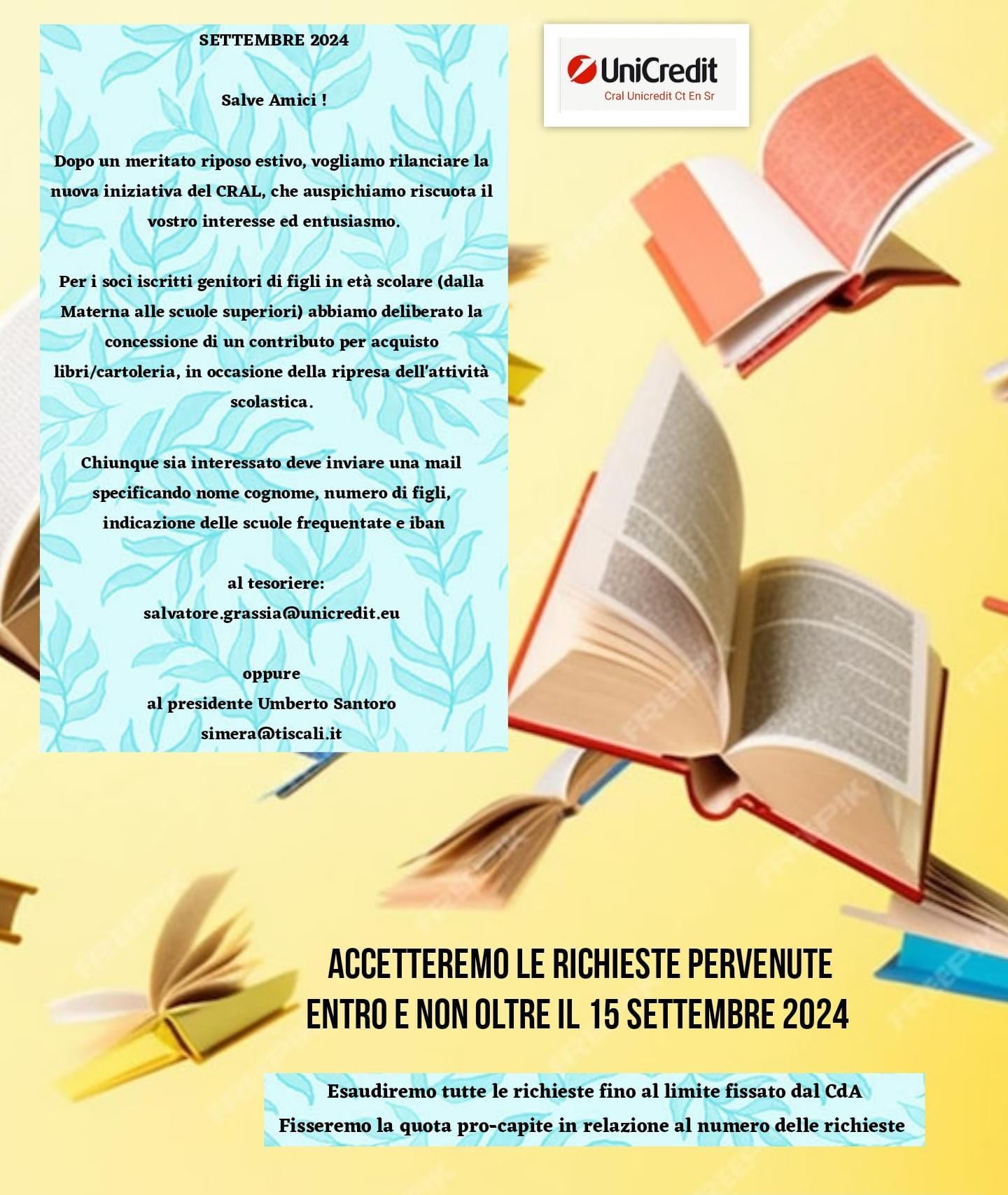 Il cral Unicredit Ct En Sr, attento alle esigenze delle famiglie con figli in età scolare, ha deciso di contribuire alle spese per l'acquisto di libri e cartoleria per l'imminente anno scolastico 2024/2025. Tutti i colleghi soci iscritti ed in regola con il rinnovo 2024 possono inoltrare richiesta di ottenere il contributo a mezzo mail al nostro tesoriere Salvatore Grassia. Abbiamo stanziato un plafond massimo di spesa che verrà suddiviso tra tutti i richiedenti, rispettando l'ordine cronologico di arrivo delle richieste. Avete tempo fino al 15 settembre 2024...affrettatevi! La campanella di ingresso a scuola sta per suonare!